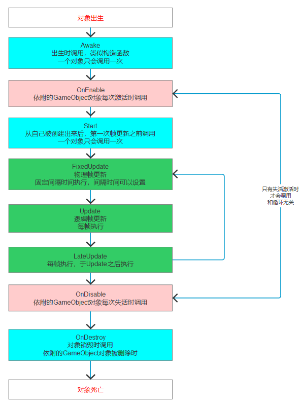 - 物体处于启用状态时,脚本状态切换才会执行OnEnable方法和OnDisable方法