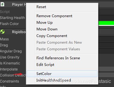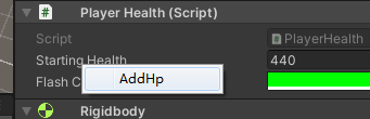 1 2 3 4 5 6 7 8 9 10 11 12 13 14 15 16 17 18 19 20 using System.Collections;using System.Collections.Generic;using UnityEngine; public class PlayerHealth : MonoBehaviour { [ContextMenuItem("AddHp" ,"AddHp" ) ] public int startingHealth; public Color flashColor; void AddHp () { startingHealth += 30 ; } [ContextMenu("SetColor" ) ] void SetColor () { flashColor = Color.green; } }