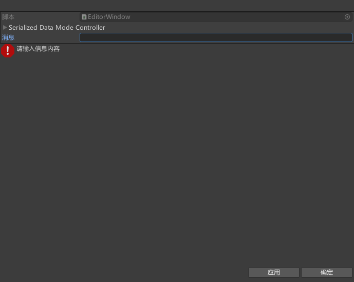 1 2 3 4 5 6 7 8 9 10 11 12 13 14 15 16 17 18 19 20 21 22 23 24 25 26 27 28 29 30 31 32 33 34 35 36 37 38 39 40 41 42 43 44 45 46 47 48 49 50 51 52 53 54 55 56 57 58 59 60 61 62 63 64 65 66 public class EditorWindow : ScriptableWizard { public string msg = "" ; [MenuItem("MyWindow/First Window" ) ] private static void ShowWindow () { ScriptableWizard.DisplayWizard<EditorWindow>("WindowExample1" , "确定" , "应用" ); } private void OnEnable () { Debug.Log("OnEnable" ); } private void OnDisable () { Debug.Log("OnDisable" ); } private void OnDestroy () { Debug.Log("OnDestroy" ); } private void OnWizardUpdate () { Debug.Log("OnWizardUpdate" ); if (string .IsNullOrEmpty(msg)) { errorString = "请输入信息内容" ; helpString = "" ; } else { errorString = "" ; helpString = "请点击确认按钮" ; } } void OnWizardOtherButton () { Debug.Log("OnWizardOtherButton" ); } void OnWizardCreate () { Debug.Log("OnWizardCreate" ); } protected override bool DrawWizardGUI () { return base .DrawWizardGUI(); } }