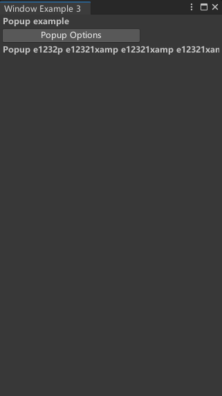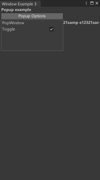1 2 3 4 5 6 7 8 9 10 11 12 13 14 15 16 17 18 19 20 21 22 23 24 25 26 27 28 29 30 31 32 33 34 35 36 37 38 39 40 41 42 43 44 45 46 47 48 49 50 51 52 53 54 55 56 57 58 59 public class WindowExample3 : EditorWindow { private static WindowExample3 window; private PopWindowExample popWindow = new PopWindowExample(); private Rect buttonRect; [MenuItem("MyWindow/Third Window" ) ] private static void ShowWindow () { window = EditorWindow.GetWindow<WindowExample3>("Window Example 3" ); window.Show(); } private void OnGUI () { GUILayout.Label("Popup example" , EditorStyles.boldLabel); if (GUILayout.Button("Popup Options" , GUILayout.Width(200 ))) { PopupWindow.Show(buttonRect, popWindow); } if (Event.current.type == EventType.Repaint) buttonRect = GUILayoutUtility.GetLastRect(); GUILayout.Label("Popup e1232p e12321xamp e12321xamp e12321xam1xample" , EditorStyles.boldLabel); } }public class PopWindowExample : PopupWindowContent { bool toggle = true ; public override void OnOpen () { Debug.Log("OnOpen" ); } public override void OnGUI (Rect rect ) { EditorGUILayout.LabelField("PopWindow" ); toggle = EditorGUILayout.Toggle("Toggle" , toggle); } public override void OnClose () { Debug.Log("OnClose" ); } public override Vector2 GetWindowSize () { return new Vector2(200 , 100 ); } }