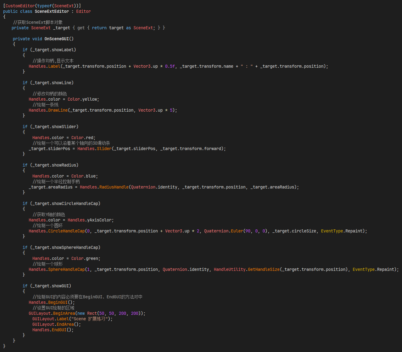 扩展Scene视图 场景视图是编辑游戏对象的窗口,扩展场景视图可以实现网格编辑,地形绘制或高级Gizmos等操作。视图的扩展主要通过OnSceneGUI()方法实现,因为场景扩展是基于场景对象的,所以可以选择不同的对象实现不同的场景视图操作。