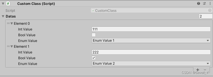 1 2 3 4 5 6 7 8 9 10 11 12 13 14 15 16 17 18 19 20 21 22 23 24 25 26 27 28 29 30 [Serializable ]public class MonoTest { public enum EnumValue { EnumValue1, EnumValue2, EnumValue3, } public int intValue; public bool boolValue; public EnumValue enumValue; } [CustomPropertyDrawer(typeof(MonoTest)) ]public class MonoTestEditor : PropertyDrawer { public override void OnGUI (Rect position, SerializedProperty property, GUIContent label ) { var nameRect = new Rect(position.x, position.y, 222 , position.height); var amountRect = new Rect(position.x + 222 , position.y, 222 , position.height); var unitRect = new Rect(position.x + 222 + 222 , position.y, 222 , position.height); EditorGUIUtility.labelWidth = 100 ; EditorGUI.PropertyField(nameRect, property.FindPropertyRelative("intValue" )); EditorGUI.PropertyField(amountRect, property.FindPropertyRelative("boolValue" )); EditorGUI.PropertyField(unitRect, property.FindPropertyRelative("enumValue" )); } }