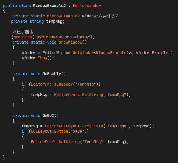 1 2 3 4 5 6 7 8 9 10 11 12 13 14 15 16 17 18 19 20 21 22 23 24 25 26 27 28 29 30 31 32 33 34 35 36 37 38 39 40 41 42 43 public class WindowExample2 : EditorWindow { private static WindowExample2 window; [MenuItem("MyWindow/Second Window" ) ] private static void ShowWindow () { window = EditorWindow.GetWindow<WindowExample2>("Window Example" ); window.Show(); } private void OnEnable () { Debug.Log("OnEnable" ); } private void OnGUI () { EditorGUILayout.LabelField("Your Second Window" , EditorStyles.boldLabel); } private void Update () { Debug.Log("Update" ); } private void OnDisable () { Debug.Log("OnDisable" ); } private void OnDestroy () { Debug.Log("OnDestroy" ); } }