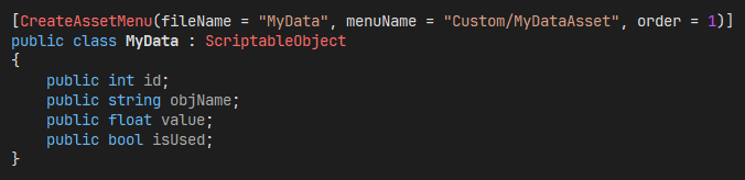 ScriptableObject 只需要继承自ScriptableObject,然后在类中定义需要的数据即可。