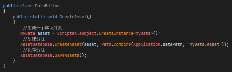 也可以通过方法调用来创建资源,最终得到的资源是一样的,该脚本需要放在Editor文件夹中。