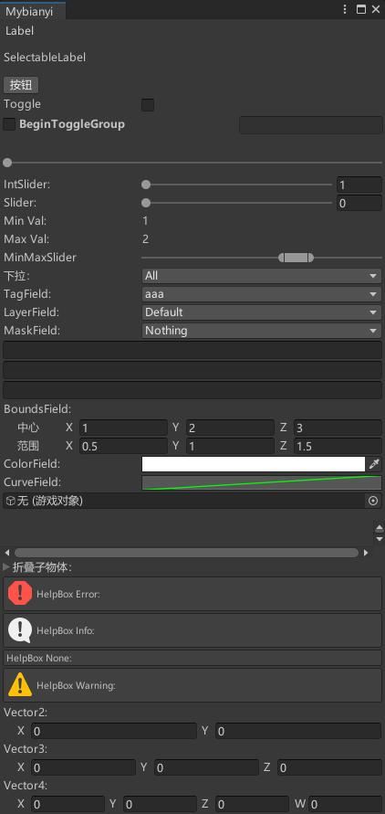 1 2 3 4 5 6 7 8 9 10 11 12 13 14 15 16 17 18 19 20 21 22 23 24 25 26 27 28 29 30 31 32 33 34 35 36 37 38 39 40 41 42 43 44 45 46 47 48 49 50 51 52 53 54 55 56 57 58 59 60 61 62 63 64 65 66 67 68 69 70 71 72 73 74 75 76 77 78 79 80 81 82 83 84 85 86 87 88 89 90 91 92 93 94 95 96 97 98 99 100 101 102 103 104 105 106 107 108 109 110 111 112 113 114 115 116 117 118 119 120 121 122 123 124 125 126 127 128 129 130 131 132 133 134 135 136 137 138 139 140 141 142 143 144 145 146 using System.Collections;using System.Collections.Generic;using UnityEngine;using UnityEditor; public class Mybianyi : EditorWindow { string PasswordField = "" ; string m_textArea = "" ; float sliders = 0 ; int slidera = 0 ; string BeginToggleGroup = "BeginToggleGroup" ; bool ToggleGroup = false ; string Textfield1 = "" ; string Textfield2 = "" ; bool fg = false ; float sum = 0 ; int count = 0 ; string tag = "aaa" ; int Layerfield=0 ; string [] pathname = new string [] { "All" , "Asset" , "..." }; float minVal = 1 ; float maxVal = 2 ; float minLimit = -5 ; float maxLimit = 5 ; static Vector3 center = new Vector3(1 , 2 , 3 ); static Vector3 size1 = new Vector3(1 , 2 , 3 ); Bounds _bounds = new Bounds(center, size1); Color m_color = Color.white; AnimationCurve m_curve = AnimationCurve.Linear(0 , 0 , 10 , 10 ); Vector2 size = new Vector2(200 ,200 ); int flags = 0 ; string [] options = new string [] { "CanJump" , "CanShoot" , "CanSwim" ,"Canabc" ,"Canacc" }; GameObject game ; bool showFoldout; Vector2 m_vector2 = new Vector2(); Vector3 m_vector3 = new Vector3(); Vector4 m_vector4 = new Vector4(); Transform selectedTransform; GameObject selectedGameObject; bool fold; bool fold2; [MenuItem("MyWindow/Window" ) ] static void window () { Mybianyi mybianyi = GetWindow<Mybianyi>(); mybianyi.Show(); } private void OnGUI () { GUILayout.Label("Label" , GUILayout.Width(60 ), GUILayout.Height(20 )); EditorGUILayout.SelectableLabel("SelectableLabel" ); if ( GUILayout.Button("按钮" , GUILayout.Width(40 ), GUILayout.Height(20 ))) { } fg = EditorGUILayout.Toggle("Toggle" , fg, GUILayout.Width(40 ), GUILayout.Height(20 )); EditorGUILayout.BeginHorizontal(); ToggleGroup = EditorGUILayout.BeginToggleGroup(BeginToggleGroup, ToggleGroup); Textfield1 = GUILayout.TextField(Textfield1); EditorGUILayout.EndToggleGroup(); EditorGUILayout.EndHorizontal(); GUILayout.Space(20 ); sum = GUILayout.HorizontalSlider(sum, 0 , 10 ); GUILayout.Space(20 ); slidera = EditorGUILayout.IntSlider("IntSlider:" , slidera, 1 , 10 ); sliders = EditorGUILayout.Slider("Slider:" ,sliders,0 ,10 ); EditorGUILayout.LabelField("Min Val:" , minVal.ToString()); EditorGUILayout.LabelField("Max Val:" , maxVal.ToString()); EditorGUILayout.MinMaxSlider("MinMaxSlider" , ref minVal, ref maxVal, minLimit, maxLimit); count = EditorGUILayout.Popup("下拉:" ,count,pathname); tag = EditorGUILayout.TagField("TagField:" , tag); Layerfield = EditorGUILayout.LayerField("LayerField:" , Layerfield); flags = EditorGUILayout.MaskField("MaskField:" , flags, options); Textfield1 = GUILayout.TextField(Textfield1); m_textArea = EditorGUILayout.TextArea(m_textArea); PasswordField = GUILayout.PasswordField(PasswordField, '*' ); _bounds = EditorGUILayout.BoundsField("BoundsField:" , _bounds); m_color = EditorGUILayout.ColorField("ColorField:" , m_color); m_curve = EditorGUILayout.CurveField("CurveField:" , m_curve); game = (GameObject) EditorGUILayout.ObjectField(game,typeof (GameObject),true ); GUILayout.Space(10 ); GUILayout.BeginHorizontal(); GUILayout.EndHorizontal(); GUILayout.BeginVertical(); GUILayout.EndVertical(); size = GUILayout.BeginScrollView(size,true ,true ); GUILayout.Space(40 ); GUILayout.EndScrollView(); showFoldout = EditorGUILayout.Foldout(showFoldout, "折叠子物体:" ); if (showFoldout) { EditorGUI.indentLevel++; EditorGUILayout.LabelField("折叠块内容1" ); EditorGUI.indentLevel++; EditorGUILayout.LabelField("折叠块内容2" ); EditorGUI.indentLevel--; EditorGUI.indentLevel--; EditorGUILayout.LabelField("折叠块内容3" ); } EditorGUILayout.HelpBox("HelpBox Error:" , MessageType.Error); EditorGUILayout.HelpBox("HelpBox Info:" , MessageType.Info); EditorGUILayout.HelpBox("HelpBox None:" , MessageType.None); EditorGUILayout.HelpBox("HelpBox Warning:" , MessageType.Warning); m_vector2 = EditorGUILayout.Vector2Field("Vector2:" , m_vector2); m_vector3 = EditorGUILayout.Vector3Field("Vector3:" , m_vector3); m_vector4 = EditorGUILayout.Vector4Field("Vector4:" , m_vector4); } }