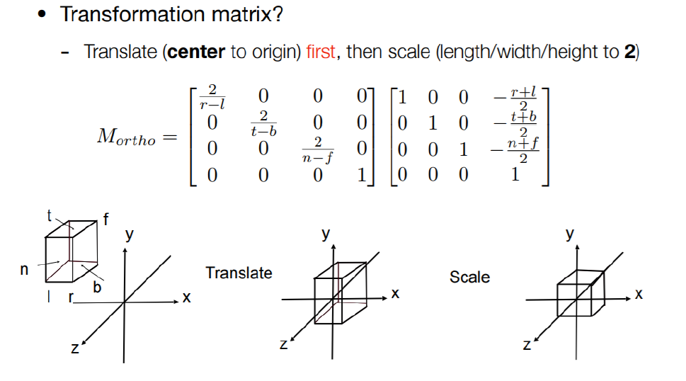 这个原始的立方体可以视作我们规定的可视范围,分别代表屏幕的长度,宽度,深度。我们通过变换矩阵将给定的立方体变换到[-1,1]^3的标准立方体上,只需先平移,再缩放。
