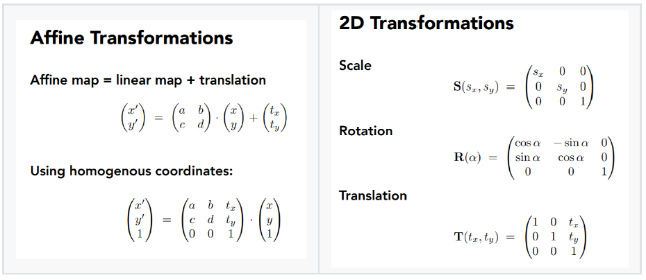 $\begin{pmatrix} x’ \\ y’ \\ w’ \end{pmatrix} = \begin{pmatrix} 1 & 0 & t_x \\ 0 & 1 & t_y \\ 0 & 0 & 1 \end{pmatrix} \cdot \begin{pmatrix} x \\ y \\ 1 \end{pmatrix} = \begin{pmatrix} x + t_x \\ y + t_y \\ 1 \end{pmatrix}$
