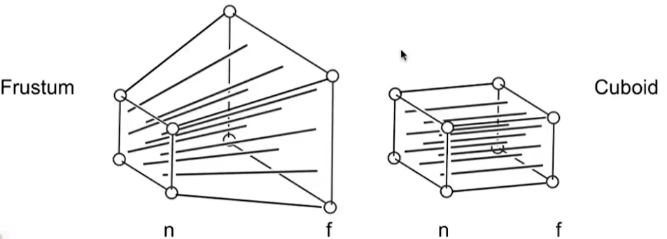 透视投影: 把视锥体压缩成一个长方体,能够体现近大远小的视觉特点。