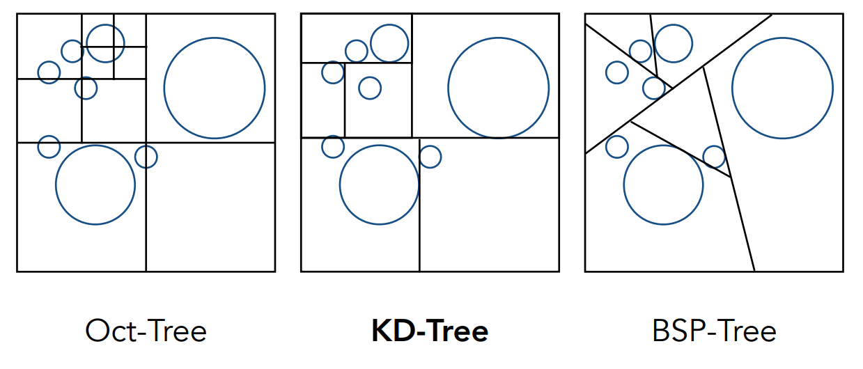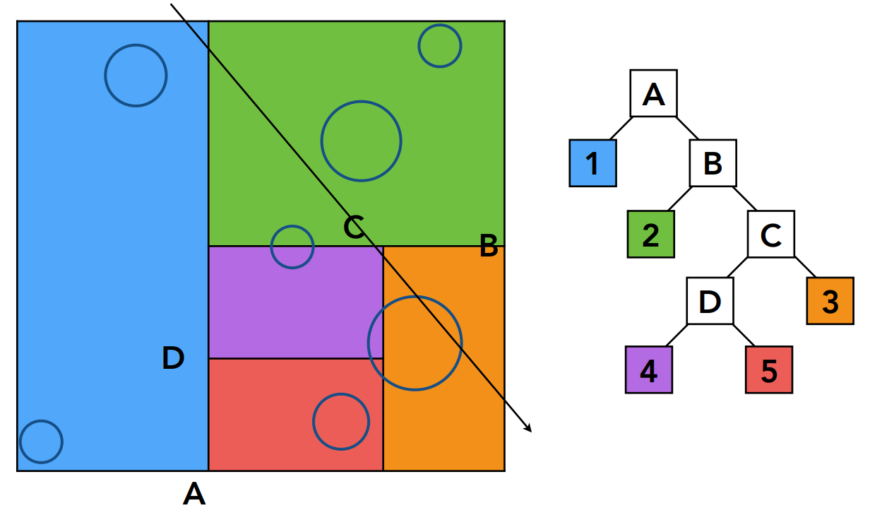 - 每次把空间划分为两份,x,y,z轴轮流切分,直到被切分节点中不存在物体则停止