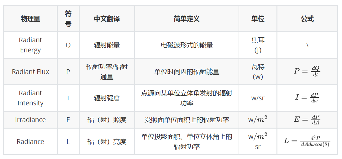辐射度量学给出了一系列度量方法和单位去定义光照,它定义了光照在空间中的属性,并且这在物理上是完全正确的