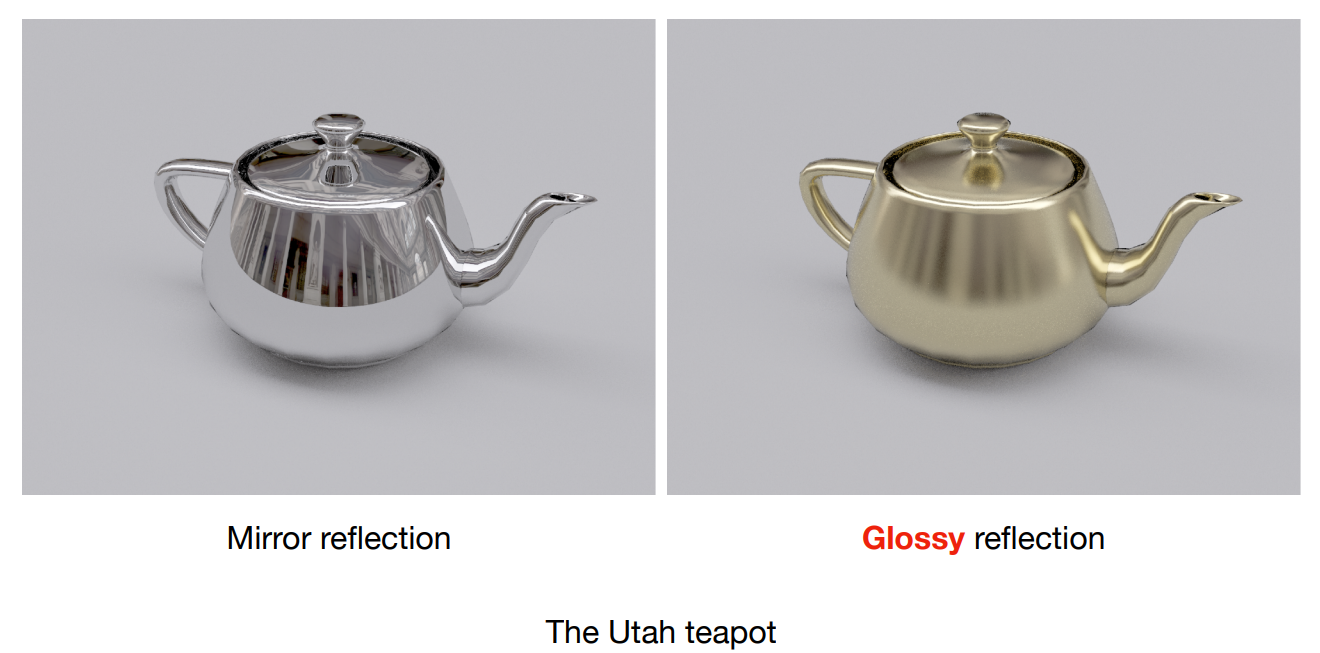 其中一个问题,拿经典的Utah teaport为例,whitted光追只能做左图的光照效果,而对于那种有光泽但不全是镜面反射的glossy材质(右图),whitted做出来的效果并不尽如人意