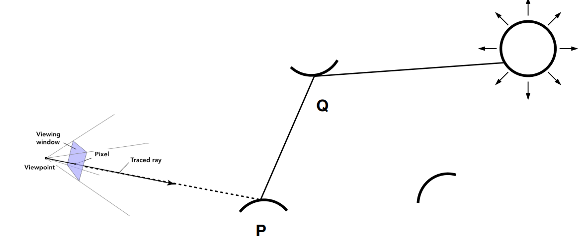 P点的着色需要Q点的环境光照信息,而Q点的环境光照信息又必须包含其他物体的环境光照信息,如此需要追踪的光线数量会呈指数级增长