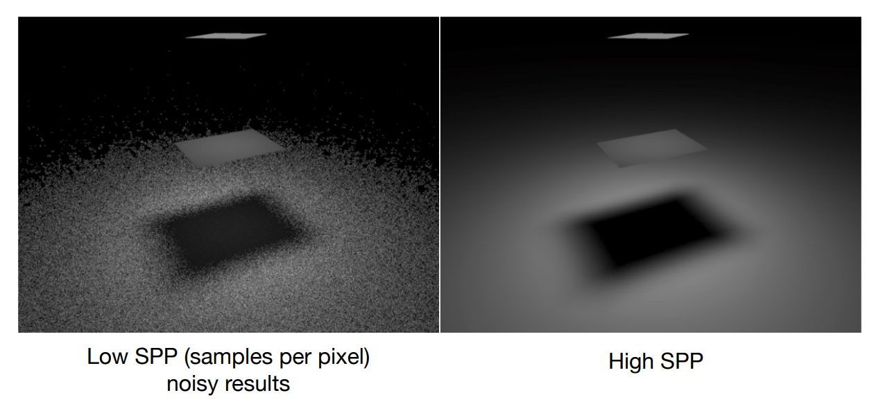 - 光源太小,采样可能错过光源:如果光源面积很小,而采样率不高,那么从着色点(被照亮的点)发出的随机光线可能完全错过光源,导致该点看起来过暗,即使它理论上应该被照亮。