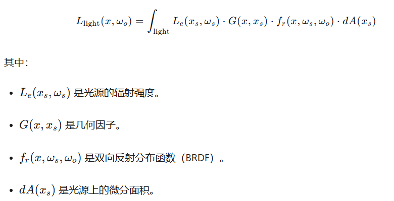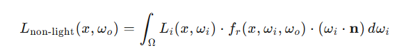 - $L_e(x,ω_o)$:表示点 x 在方向 $ω_o$上的自身发光强度(发射光强),对于非光源物体,这一项通常为零。