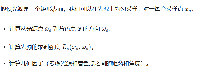 - 原理:直接在光源表面采样,计算从光源到着色点的光线贡献。
