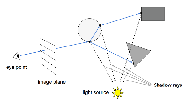 - 这一点发生了漫反射:如果光源能看见着色点(着色点不在阴影中),那么就生成一条有效光路,计算能量并着色(我们很容易知道这个着色点的法线,入射方向等信息,这时候可以用各种各样的着色模型(如Blinn Phong))