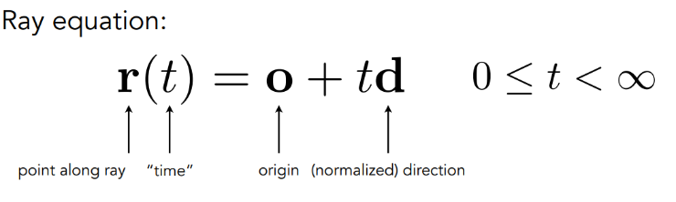 为了研究光线与物体求交问题,我们需要先定义光线:一个光线可以有一个点(光源)和一个方向(光线方向)确定,则可设光线上的点的表达式: