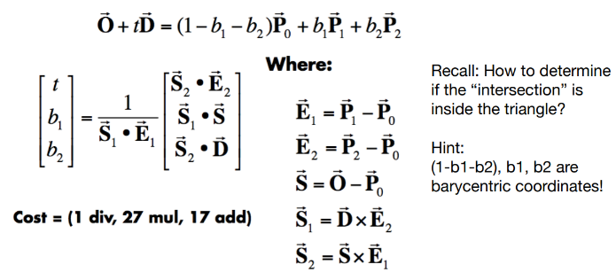 Möller Trumbore Algorithm——MT算法:利用重心坐标,交点可以被重心坐标表示出来,三个未知数三个方程,可求解