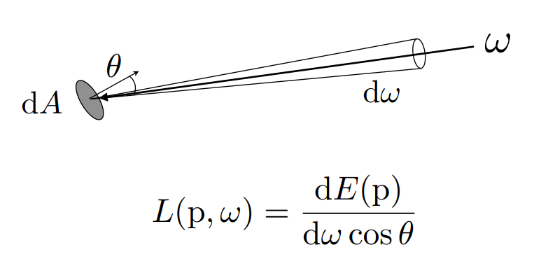 相比于Irradiance的单位面积上的能量,Radiance可以看作是单位面积上吸收到的单个方向上的能量,于是我们有