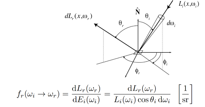 由上式,BRDF就是吸收能量后往某一方向反射时取的比例,即某个角度入射到dA面积上的能量,乘以比例fr后反射到另一个角度。
